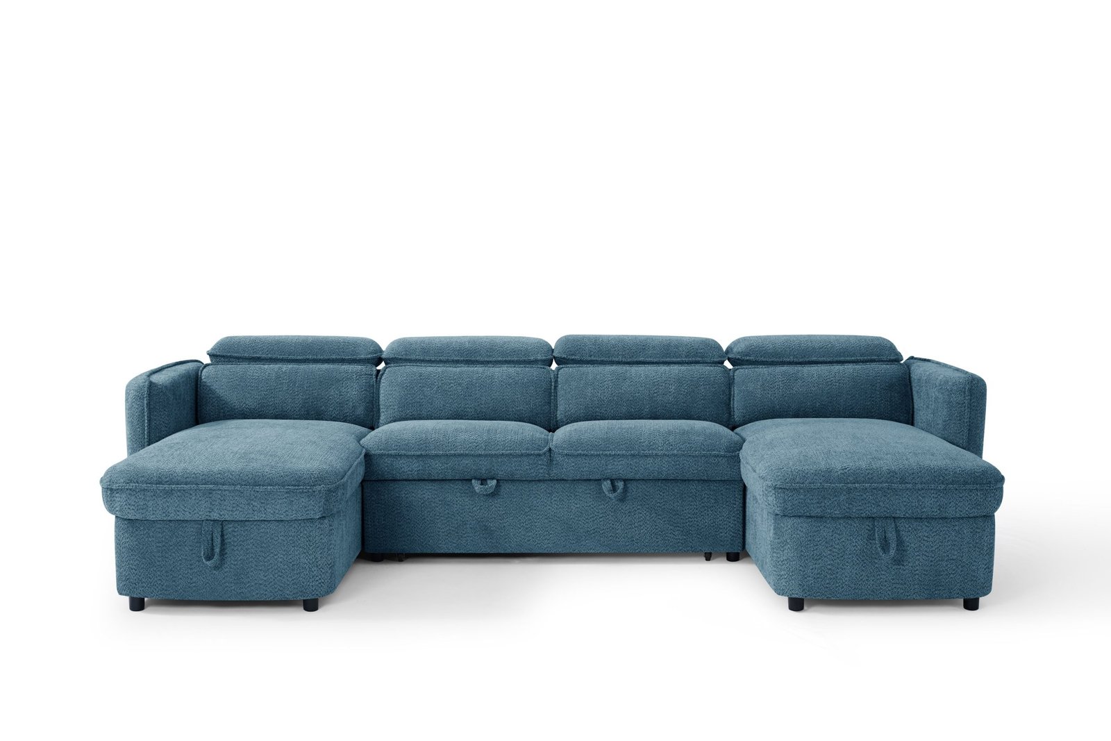 Available in Grey, Green, Blue and Beige this universal large U Shape corner sofa offers sleeping space, storage and adjustable headrests. This modern design is upholstered