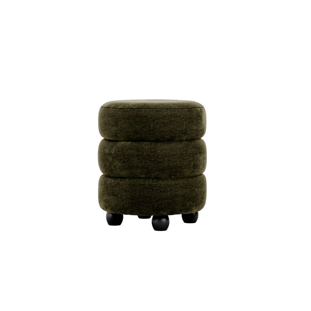 The Emi Pouffe in luxurious Olive Chenille Velvet features curved lines and round black pine feet for a modern touch. Comfortable and versatile, it’s perfect for multi-use in any space.