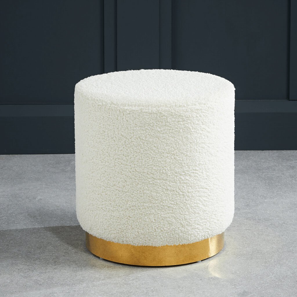 Shearling fabric pouffe sitting on top of a gold effect circular frame, is sure to become the piece to liven up your living space.