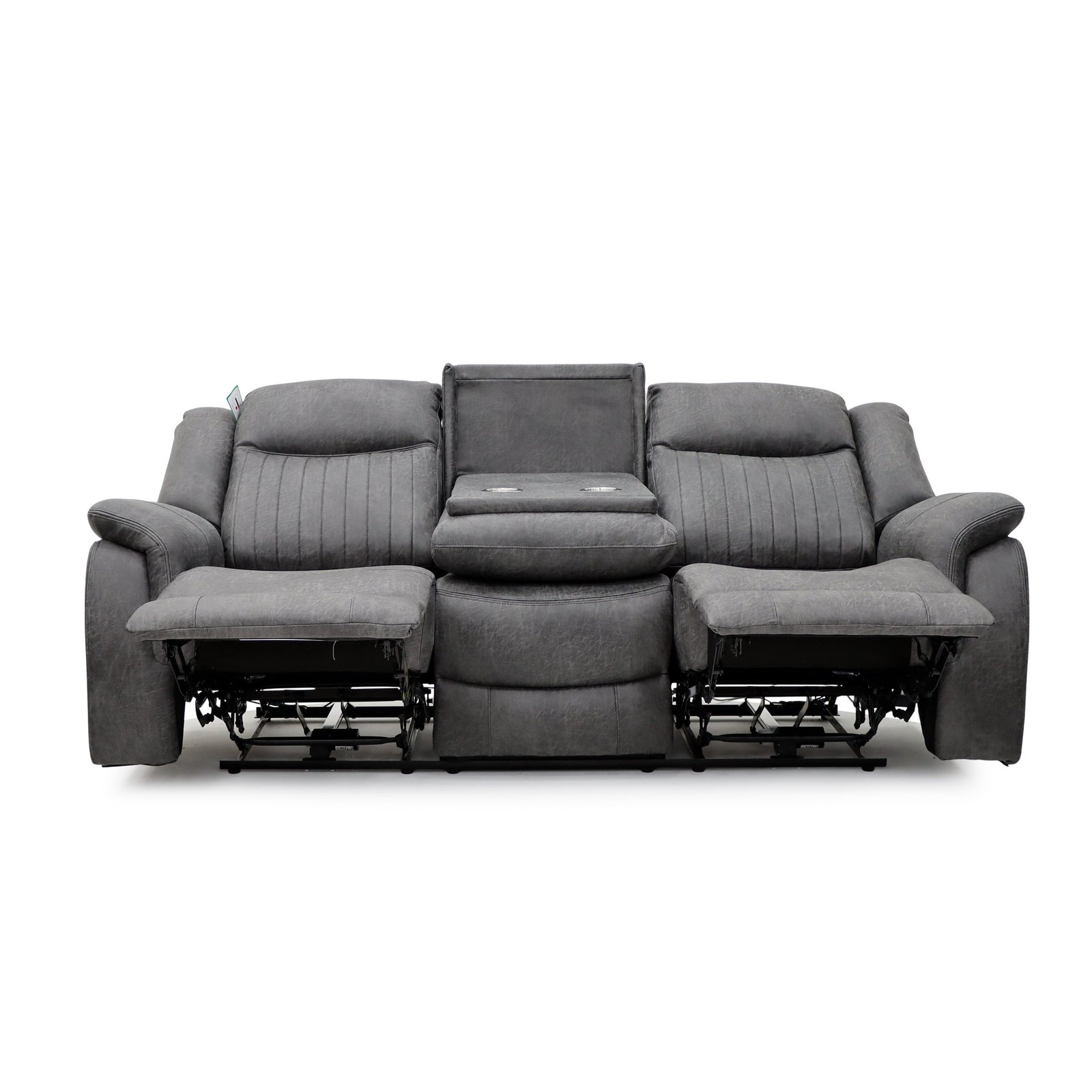 The Leon set features an electric recliner, dropdown table & cupholders, USB and USB-C charging ports. This is a classic design available in Grey Tech Fabric.
