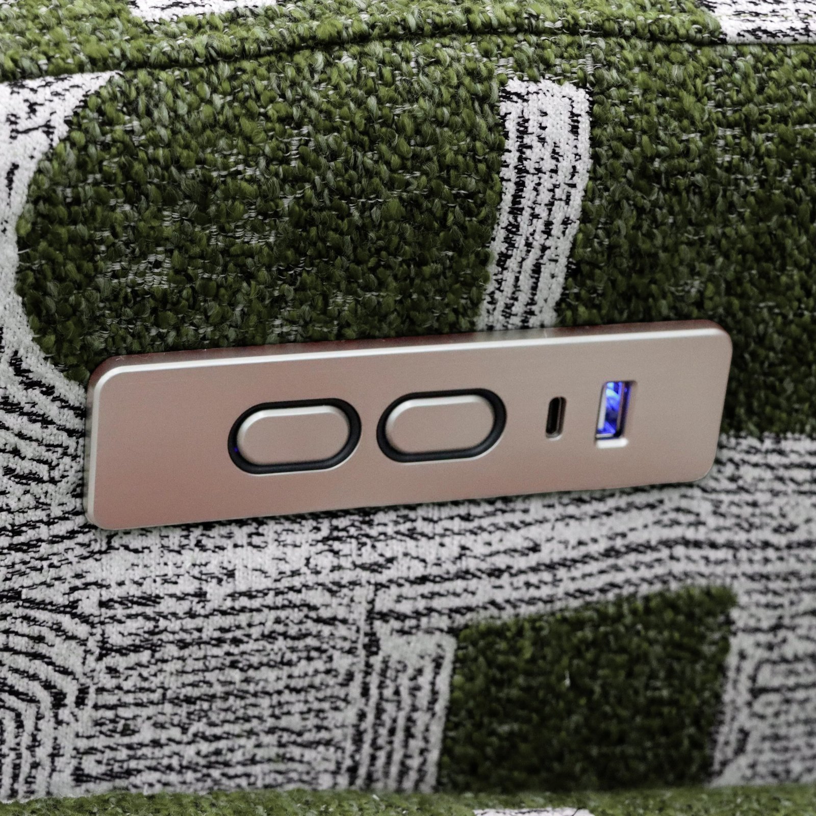 This cosy chair not only looks great, but also offers an electric reclining mechanism, rocking feature and USB/USB-C Ports. Available in Red&White Fabric and Green&White Fabric.